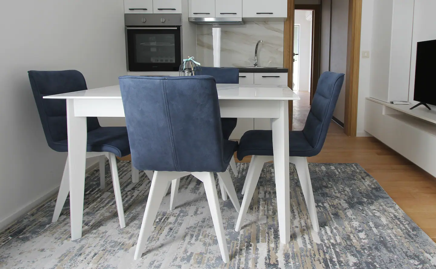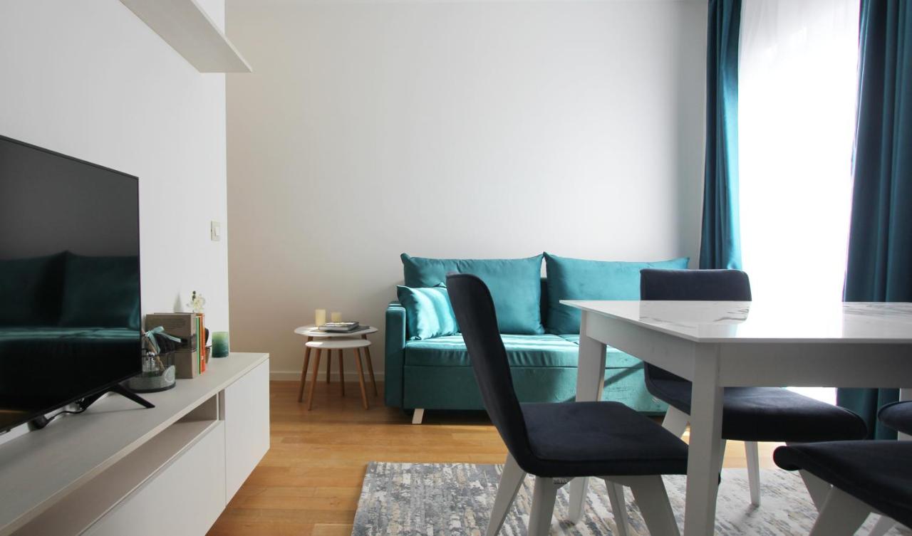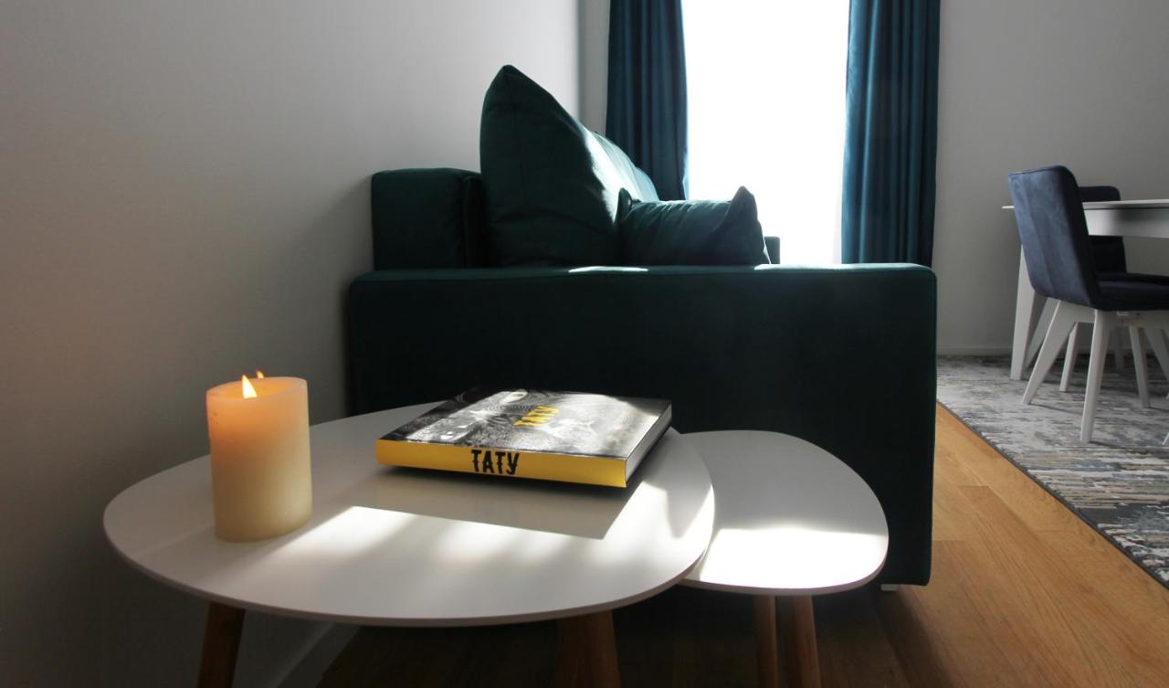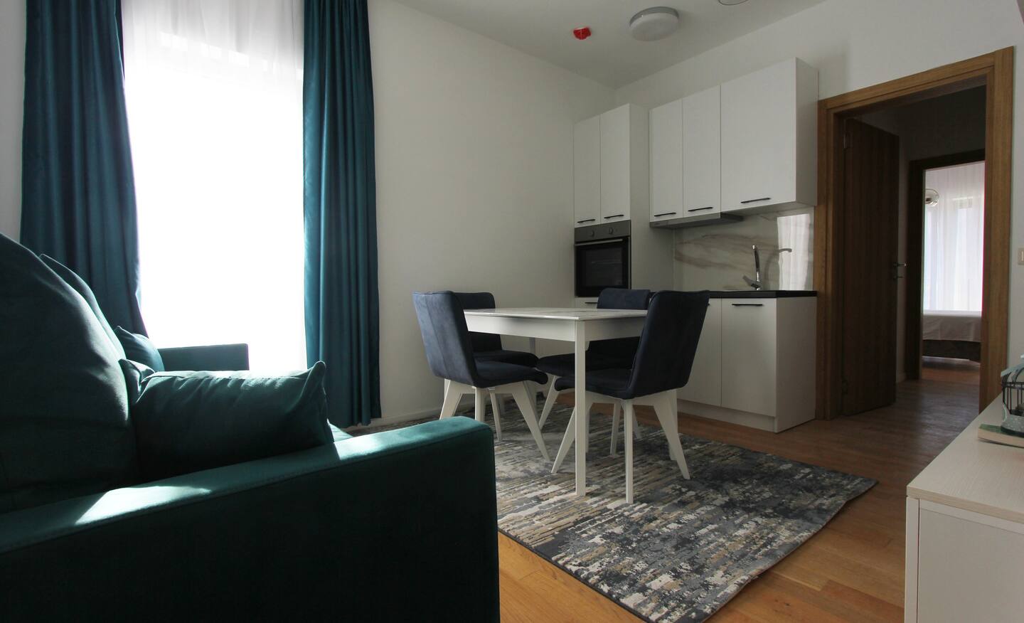 Salon to stylowa i komfortowa przestrzeń do odpoczynku po dniu pełnym wrażeń, gdzie znajduje się Smart TV, dostęp do Wi-Fi oraz wygodna sofa, która po rozłożeniu zapewnia dodatkowe miejsca do spania dla dwóch osób. W pełni wyposażona kuchnia pozwala na przygotowanie własnych posiłków i obejmuje lodówkę z zamrażarką, płytę indukcyjną, piekarnik, czajnik, naczynia, sztućce i inne niezbędne akcesoria. Stół jadalniany z czterema krzesłami tworzy przyjemne miejsce do wspólnych posiłków.