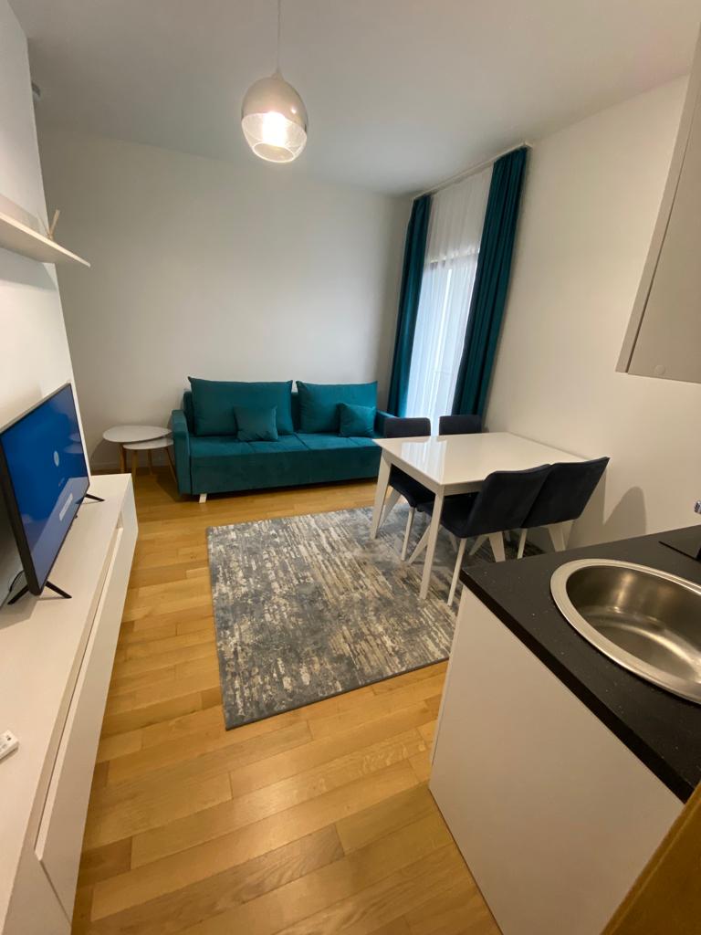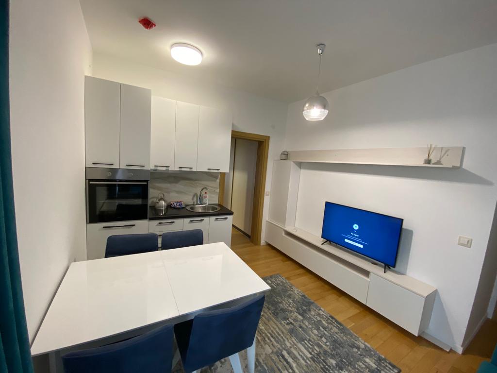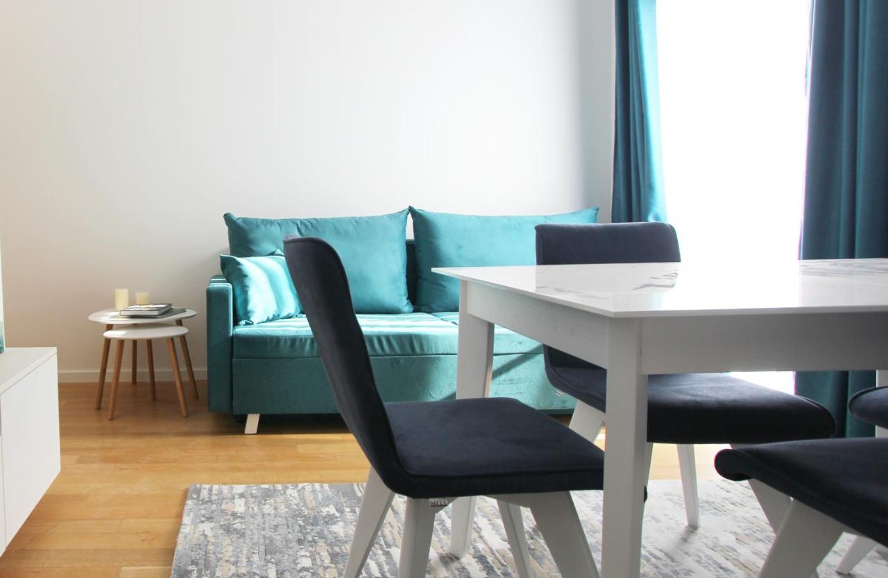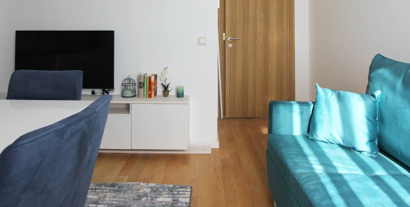 Salon to stylowa i komfortowa przestrzeń do odpoczynku po dniu pełnym wrażeń, gdzie znajduje się Smart TV, dostęp do Wi-Fi oraz wygodna sofa, która po rozłożeniu zapewnia dodatkowe miejsca do spania dla dwóch osób. W pełni wyposażona kuchnia pozwala na przygotowanie własnych posiłków i obejmuje lodówkę z zamrażarką, płytę indukcyjną, piekarnik, czajnik, naczynia, sztućce i inne niezbędne akcesoria. Stół jadalniany z czterema krzesłami tworzy przyjemne miejsce do wspólnych posiłków.
